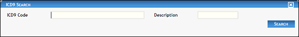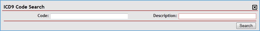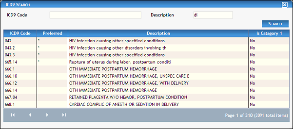 In ICD9, enter the ICD9 code on which to search. You can enter partial information to widen your search. At least two characters must be entered, and up to 10 characters can be entered as necessary.