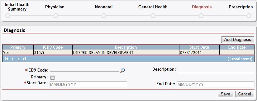 Click the Save button. The page refreshes and displays the new information in the Diagnosis table.