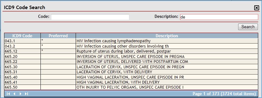 Click the Add button. The ICD9 Code Search page displays when clicked.