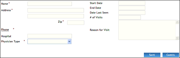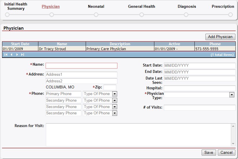 Click the Save button. The page refreshes and displays the new information in the Physician table.
