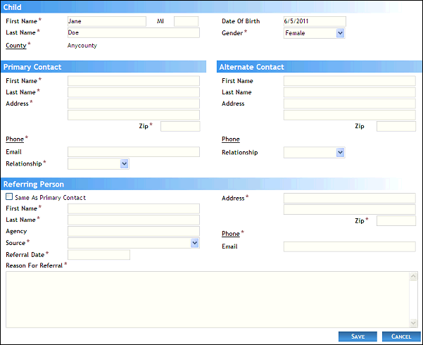 The Referral section displays the source and reason of the child's referral, which can be updated as follows: