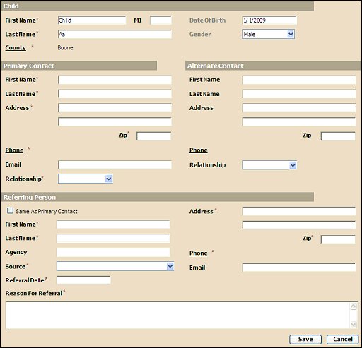 Select the Same As Primary Contact check box to indicate that the primary contact person is also the person who referred the child to the program. When this check box is checked, the page refreshes and the primary contact person's demographic information is copied from the Primary Contact section to the corresponding referral person's demographic fields. When this check box is unchecked, the page refreshes and the referral person's demographic fields are cleared.