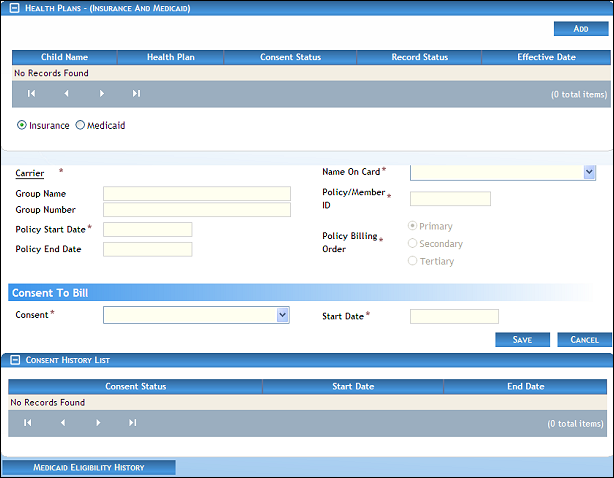 Carrier displays the insurance carrier's name. Click the Carrier link to search for and select the insurance carrier. For more information about searching for and viewing the list of carriers, see the Insurance Carrier Search page.