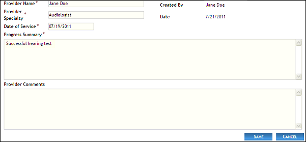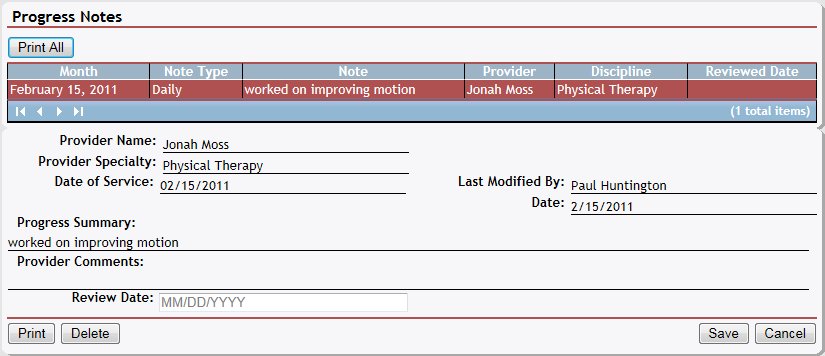 Double-click on a progress note in the table. The page refreshes and displays detailed information below the table.