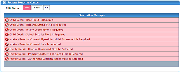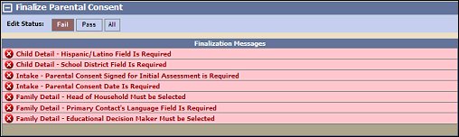Click the Finalize Parental Consent button. The page refreshes and displays a table with the status of all required edits in a Finalize Parental Consent section.