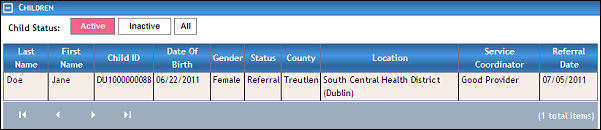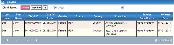 Child Search page (results found) for Coordinator/District/Provider roles