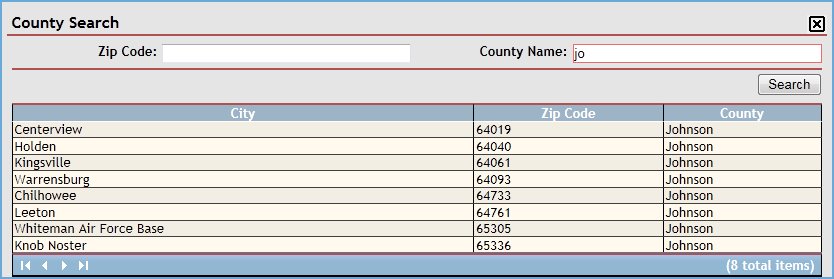 In Name, enter the name of the county on which to search. You can enter partial information to widen your search. At least two characters must be entered, and you can enter up to 50 characters as necessary.