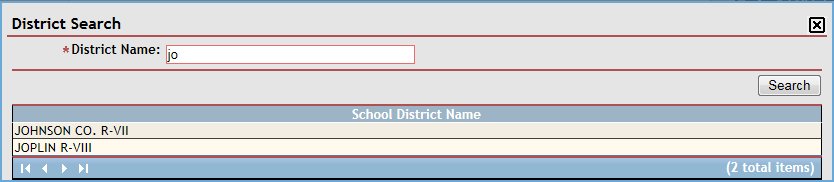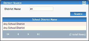 In District Name, enter the name of the school district on which to search. You can enter partial information to widen your search. At least two characters must be entered.