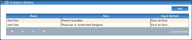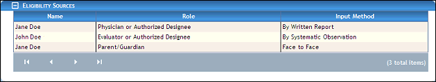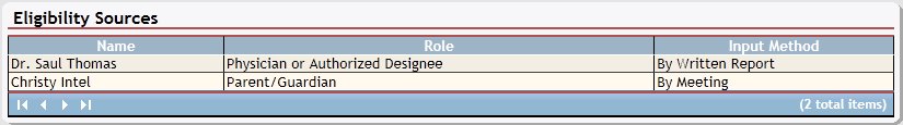 The table contains a list of all eligibility sources currently associated with the child. Detailed information about the eligibility sources displays in the following columns of the table: