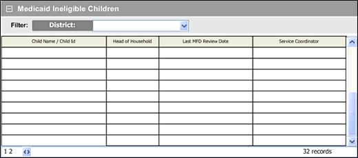 Medicaid Ineligible Children page (default view) for Coordinator/District roles