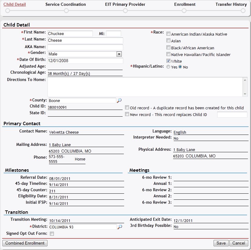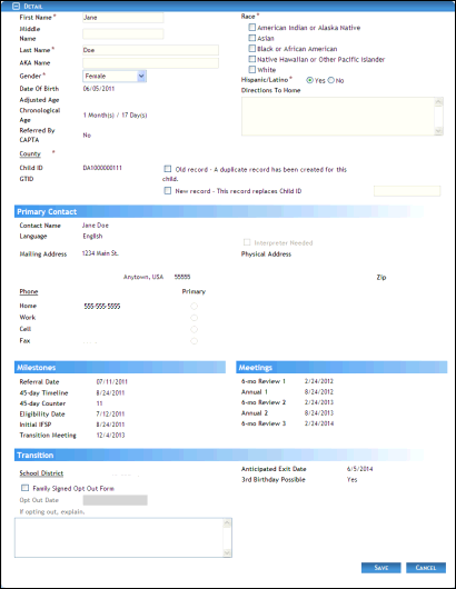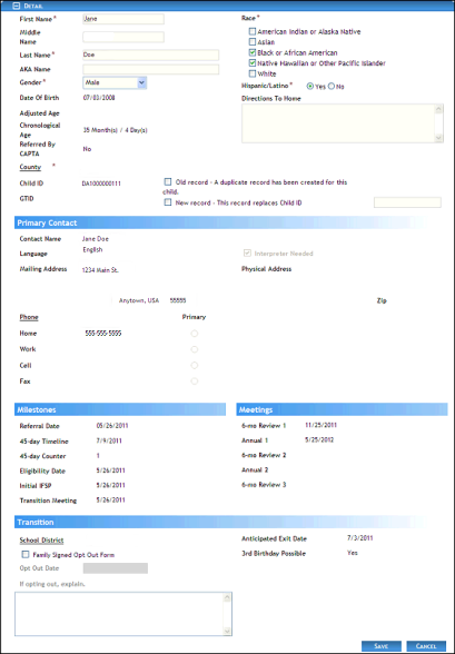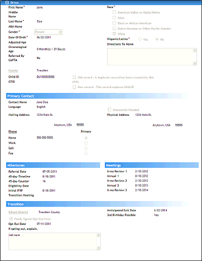 Use this tutorial to view data on the child's details, primary contact member, milestones, meetings, and transition information displayed in the Detail section of the Child Detail page.