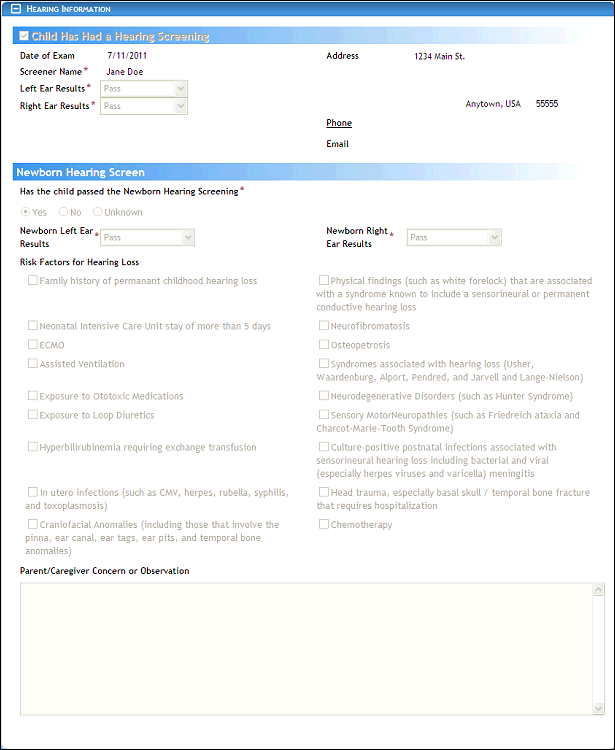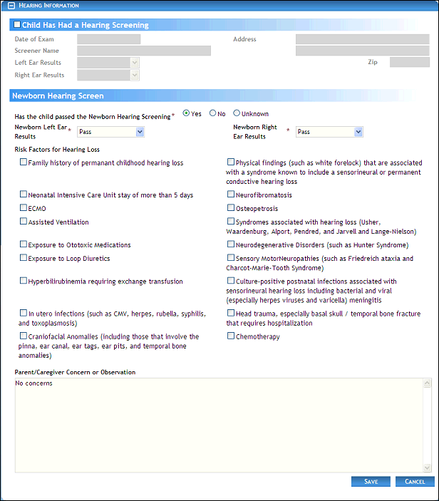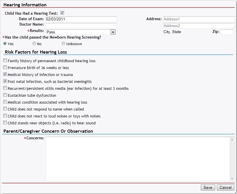 The Child Has Had a Hearing Screening check box indicates that the child had a hearing screening administered.