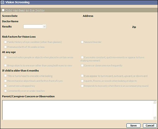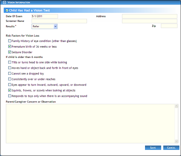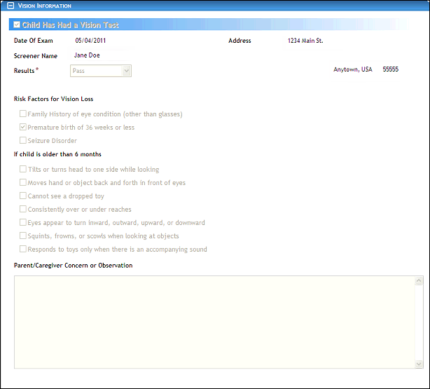 The Child Has Had a Vision Test check box indicates that the child had a vision test administered.