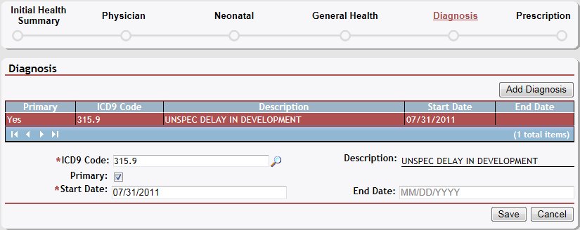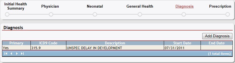 Double-click on a diagnosis in the Diagnosis table. The page refreshes and displays detailed information below the table.