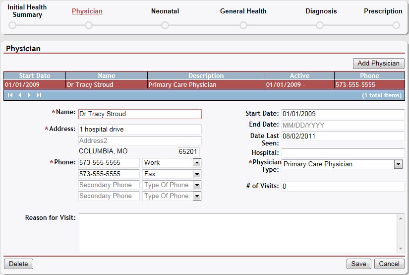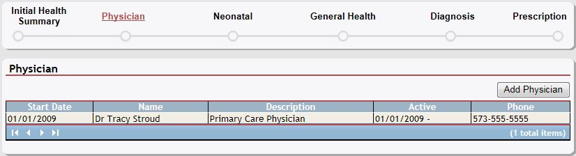 Double-click on a physician in the Physician table. The page refreshes and displays detailed information below the table.