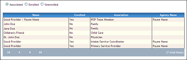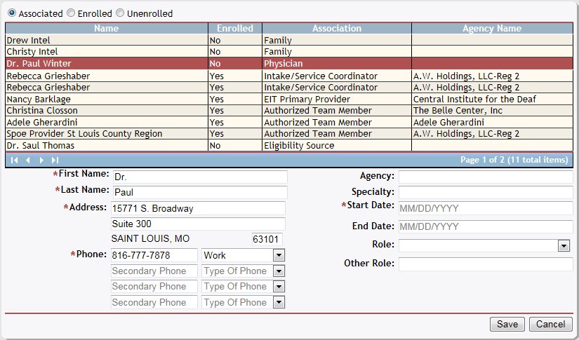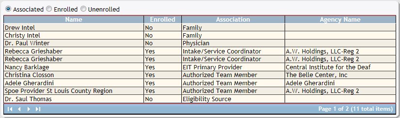 The table contains a list of all family members, providers, physicians, and coordinators currently associated with the child. Detailed information about the associates displays in the following columns of the table: