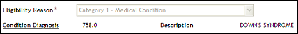 NOTE: Depending on the selection made in Eligibility Reason and your current permissions, the page displays differently and some information may be disabled or unavailable. If Category 1 - Medical Condition or Other Diagnosed Conditions is selected as the Eligibility Reason, the following control is available: