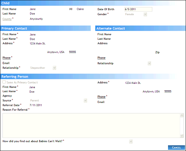 Reason For Referral displays the reason why the person was referred to the Georgia Babies Can't Wait program.