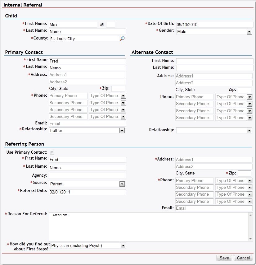 The Referral section displays the source and reason of the child's referral, and includes the following details: