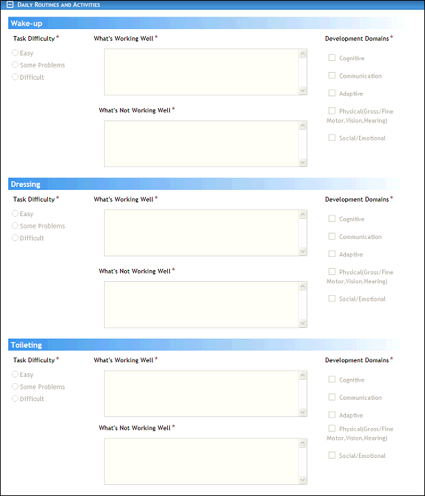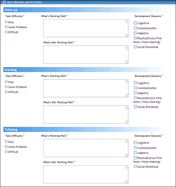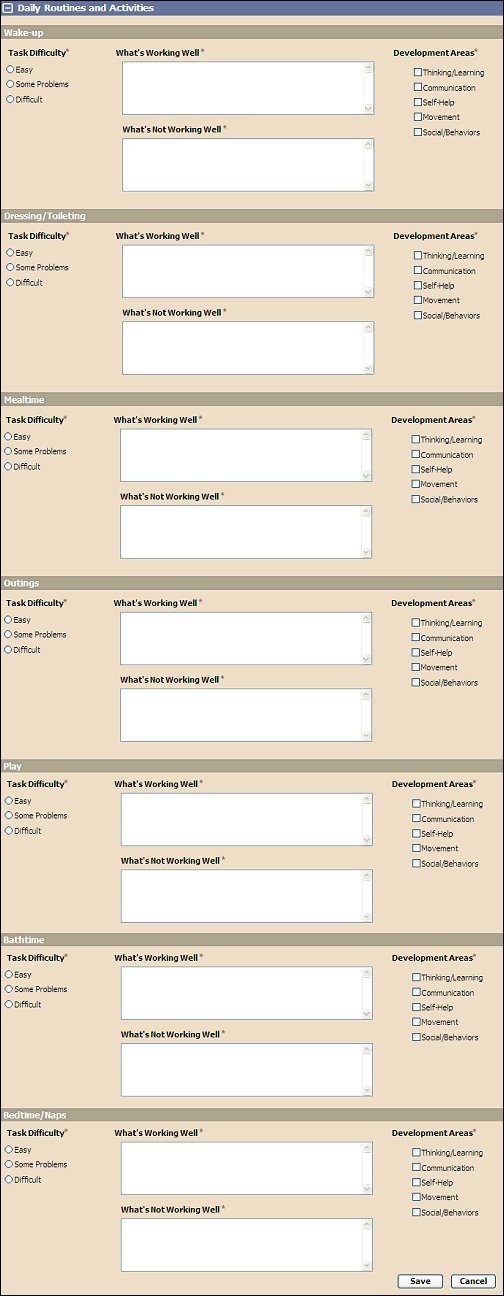 Click the Routines & Activities link. The page refreshes and displays additional fields for entry.