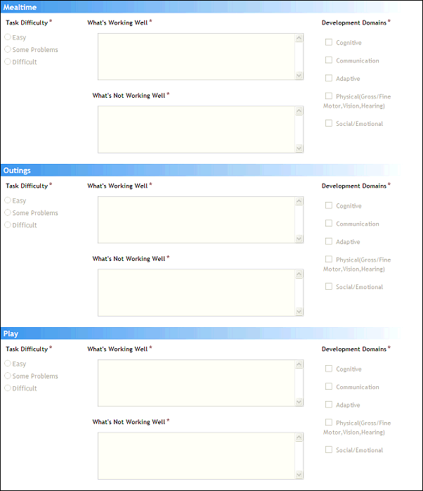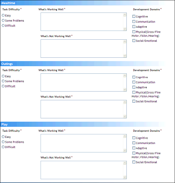 The Mealtime section contains information on how the child responds to daily mealtime routines: