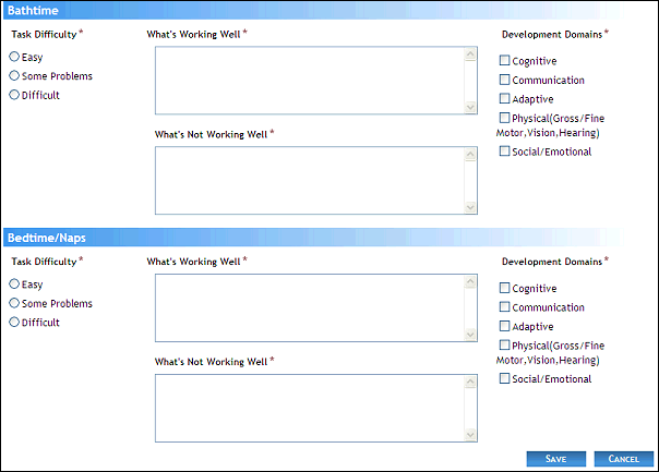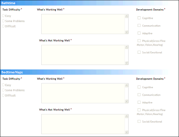 The Bedtime/Naps section contains information on how the child responds to the daily bedtime and nap routine: