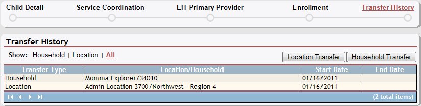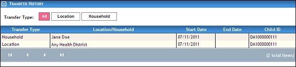 The table contains a list of all location and household transfers for the child. Detailed information about the transfers displays in the following columns of the table: