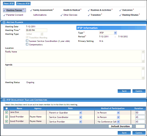 IFSP Meetings page (meeting planner view) for Provider/State roles