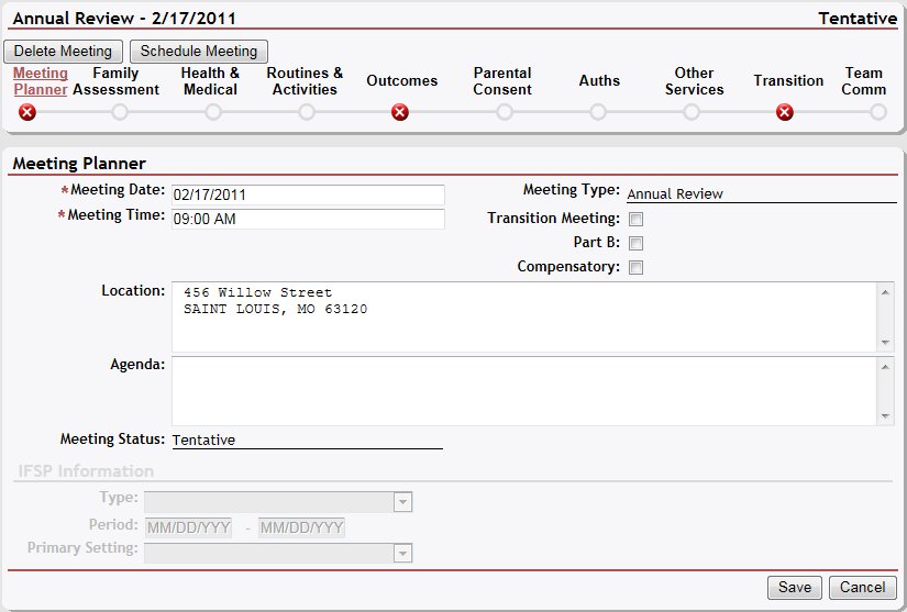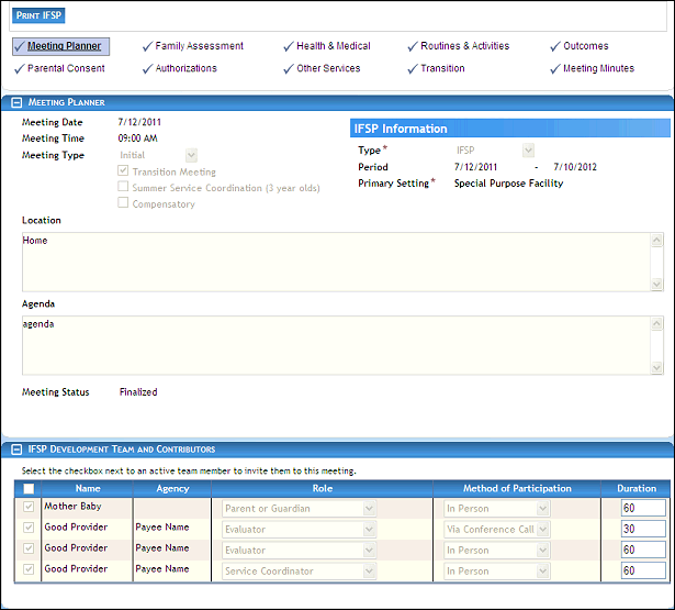 NOTE: Some of the information is displayed only for transition meetings. Transition meetings are identified in the Meeting Planner section on the IFSP Meetings page. For more information, see the Tutorial: Add an IFSP Meeting for a Child topic. Depending on your current permissions, this information may be updated. |