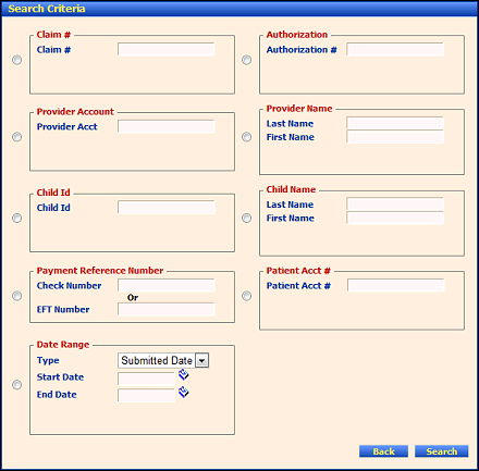 Select the appropriate radio button and enter filter criteria in the following fields as necessary to perform a search: