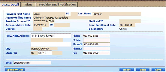 NOTE: The provider will need to contact the CFO to make changes to the specialties associated with the provider account. |