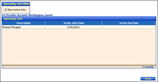 Under the Specialty List Filter, click the Show Active Only check box to display only currently active providers in the Specialty List table. When selected, the information displayed in the Specialty List table is refreshed.