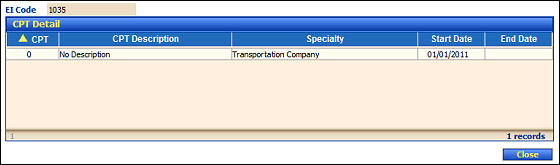 Click the CPT link next to a specific authorization in the CPT column of the Authorization Line table. The CPT for EI Code page displays.