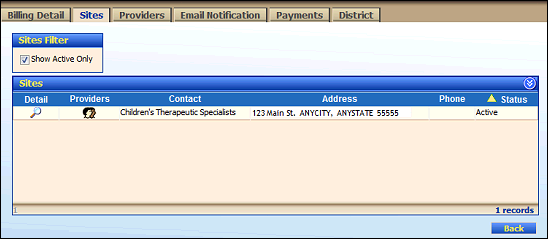 Billing Entity Sites page (default view) for Coordinator and Provider roles