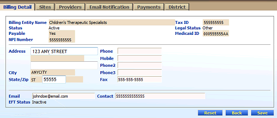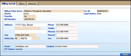 Billing Entity Detail page (default view) for Coordinator, District, and Provider roles