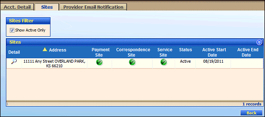 Use this tutorial to view detailed information about a specific site currently associated with a provider account from the Provider Account - Site List page.
